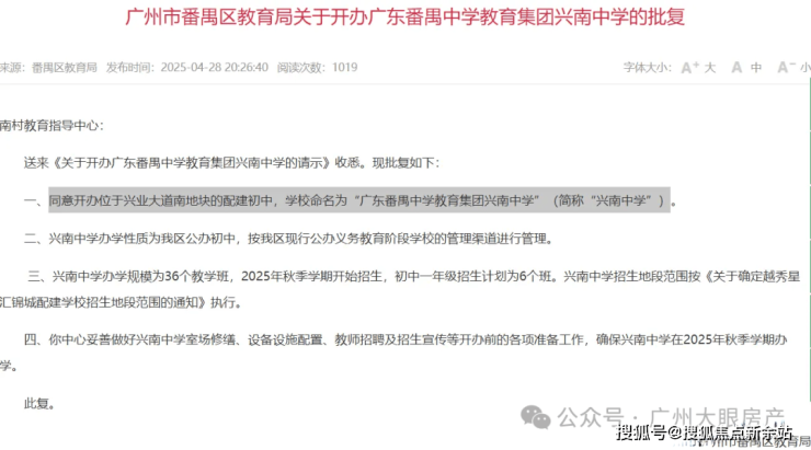 4月28日晚,广州市番禺区教育局发布公告,同意开办位于兴业大道南地块的配建初中,学校命名为“广东番禺中学教育集团兴南中学”(简称“兴南中学”)。