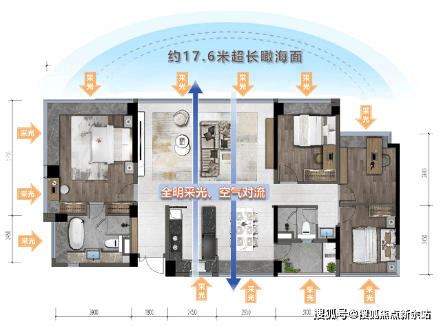 4房3厅2卫,五开间全明设计,整个户型拥有约17.6米超大面宽、12大采光面,享受“类板楼”的居住体验。