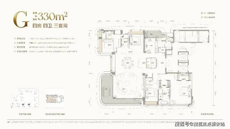 G 户型:建面约 330㎡四房四卫三套间,东南朝向,主阳台为约 17.8 米大尺度环幕全景阳台,客餐厅为十字前厅入户,约91㎡大尺度多场景转角厅,约21米东南向宽境,专梯入户直达十字前厅,每户都拥有尊崇私家门厅,私密性与仪式感拉满,主佣双动线设计,搭配超尺度户内仪式玄关,享阔绰归家体验;客厅打造多场景转角厅,兼顾家庭聚会、社交待客、私宴等多元需求,330㎡做到四房四卫三套间,中西双厨 + 独立西厨岛台 + 保姆间 + 酒窖,充分满足高端大家庭、多孩家庭或商务待客的居住需求,户型除了注重实用性与私密性,东南朝向搭配约 21 米东南向宽境与环幕端景全景视野,可揽胜天际盛景、城市繁华等复合景观,户型更升级为双总统套房格局,主卧超大总统套间配备洄游动线、大面落地窗与双独立衣帽间,私密度与奢阔感拉满,每一处空间都更舒展,居住体验更显从容。