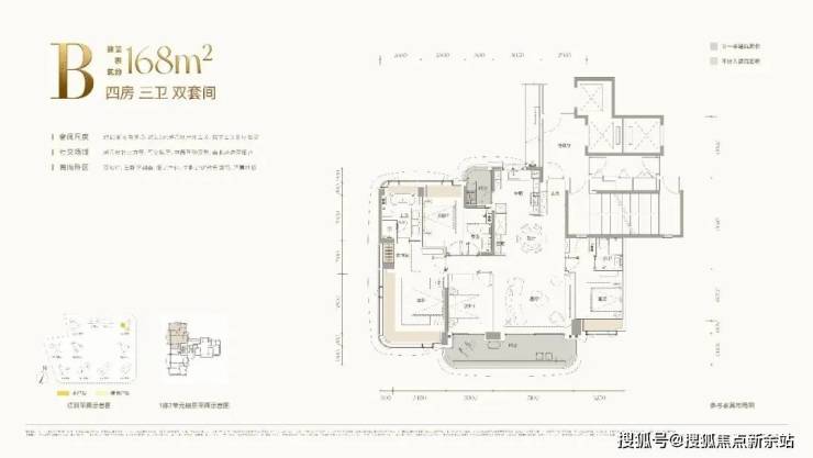 B户型:建面约168㎡四房三卫双套间,主阳台开间约:8.2米,客餐厅开间约:5.2米,3梯3户,专属电梯厅,南北通透的格局,通风采光好,满足三代同堂的居住需求,西南朝向看小区园林景观,更安静更私密,小区园林会采用立体式花园加中央水景的设计,非常漂亮。在深圳改善市场中堪称“起步即舒适”的标杆户型,动静分区清晰合理。户型核心亮点为双套间设计,主卧与一间次卧均配备独立卫浴,私密性拉满;客餐厅一体化连通巨幕阳台,采光面开阔,无论是摆放大尺度沙发,还是打造亲子互动区,空间都绰绰有余。另外两间次卧尺度适中、功能灵活,可随心改造为儿童房、客房或书房,满足多元家庭需求。整体空间零浪费、高利用率,将功能性与居住舒适度完美平衡。