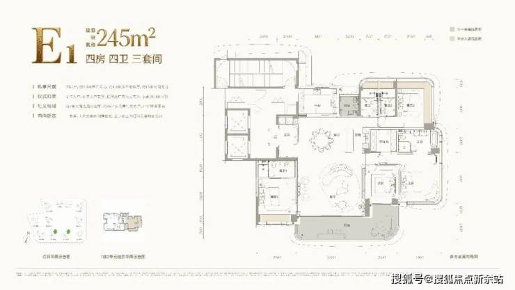 E1户型:建面约245㎡四房四卫三套间,主阳台为270° 环幕阳台,客餐厅为约7 米大面宽风光客厅,约69㎡多场景社交方厅,2 梯 2 户,每户都拥有约4.4 米开间独立电梯厅,私密性与仪式感拉满,专梯入户直达尊崇入户前厅,搭配超尺度户内仪式玄关,享阔绰归家体验;客厅打造多场景社交方厅,兼顾家庭聚会、社交待客等多元需求,245㎡做到四房四卫三套间,中西双厨 + 270° 环幕阳台,充分满足三代同堂甚至多孩家庭的居住需求,户型除了注重实用性,南向朝向搭配约18 米南向宽境,可享开阔海景、摩天轮、城市等复合景观。
