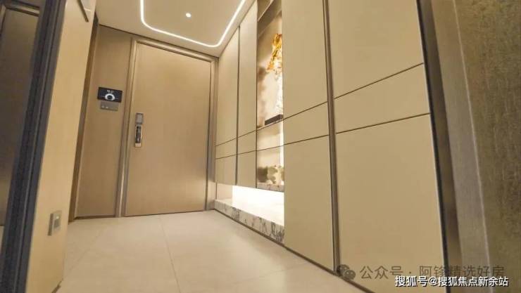 像是星级酒店同款挑高大堂,拉满归家仪式感,金属线条与高档石材互为映衬,视觉观感温润又显高级。