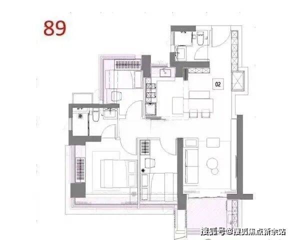 89㎡的3房2厅2卫,设计的是经典竖厅格局,进门入户玄关,LDKB一体化,S墙设计预留冰箱卡槽位,三开间朝南,主卧+1个次卧270度飘窗,L型灵动式厨房,卫生间干湿分离,得房率约92%(包含赠送),西南或东南朝向。