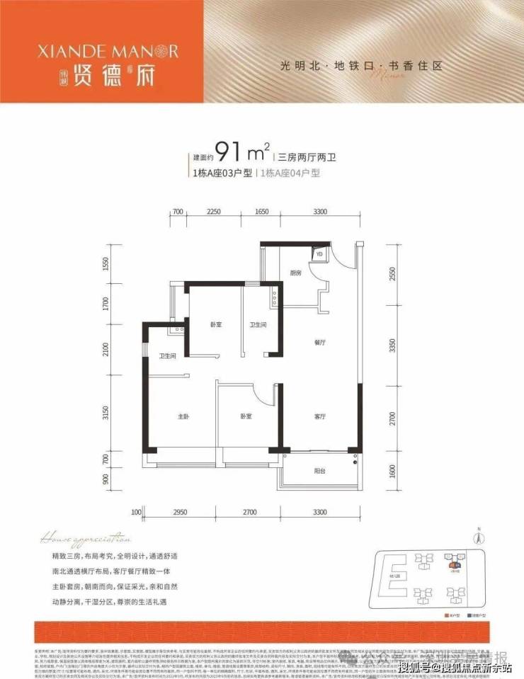 A、91平米:3房2厅2卫,正南朝向;