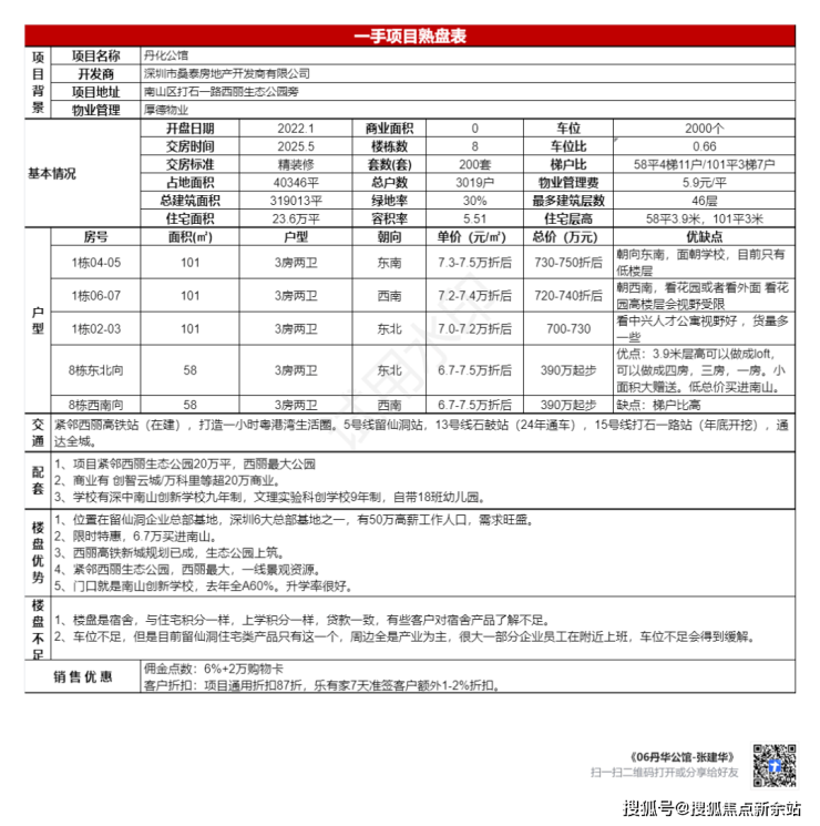项目核心价值:丹华公馆(备案名:丹华公馆)作为丹华集团在南山西丽科教城核心地段打造的地铁上盖 TOD 学府品质住宅,以建面约 89–140㎡ 改善型住宅为主力,无缝接驳地铁 5/7 号线西丽站,依托南山实验教育集团(麒麟中学/麒麟小学)优质学区资源及丹华“公馆系”精工体系,2026 年市场定位于西丽兼具交通枢纽、头部教育、大学城科创氛围与品牌品质的标杆改善资产。项目位于南山区西丽街道留仙大道与学苑大道交汇处,总占地约 324 万㎡,总建面约 162 万㎡,容积率约 394%,绿化率约 407%,规划多栋高层住宅,总户数约 655 户,车位比约 1:1.3,物业为丹华物业,物业费约 4.5 元/㎡/月,预计2027 年底精装交付,产权 70 年。