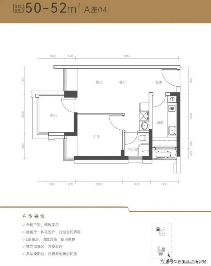 全明户型,精致实用;客餐厅一体化设计,打破空间界限;L形厨房,动线流畅,使用便捷;独立盥洗区,方便起居;多功能阳台,志趣天地随心切换。