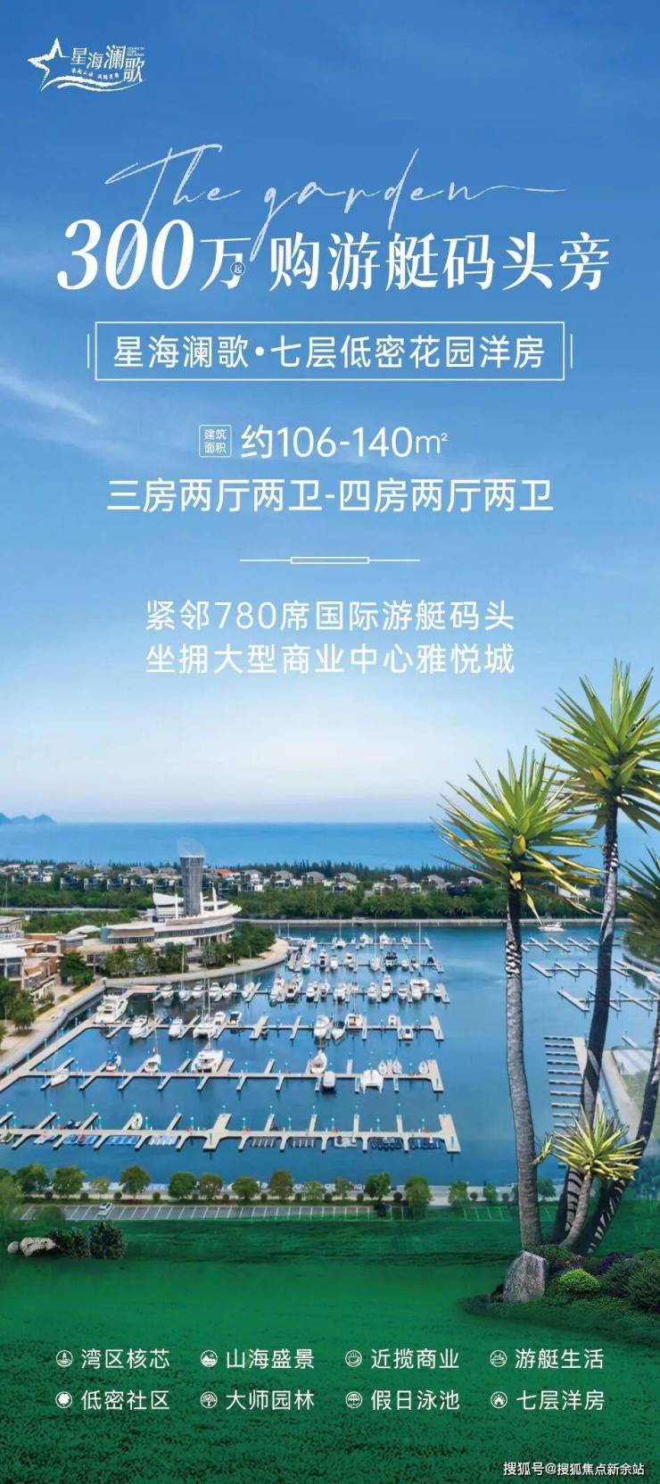 「星海澜歌」--7层低密花园洋房,位于湾区C位,紧邻780席游艇码头、海上艺术中心,拥雅悦城商业中心,981首保健康医学中心、莱佛士酒店、高尔夫球会等核心度假配套环绕,百亿醇熟配套,全方位享受繁华海居。