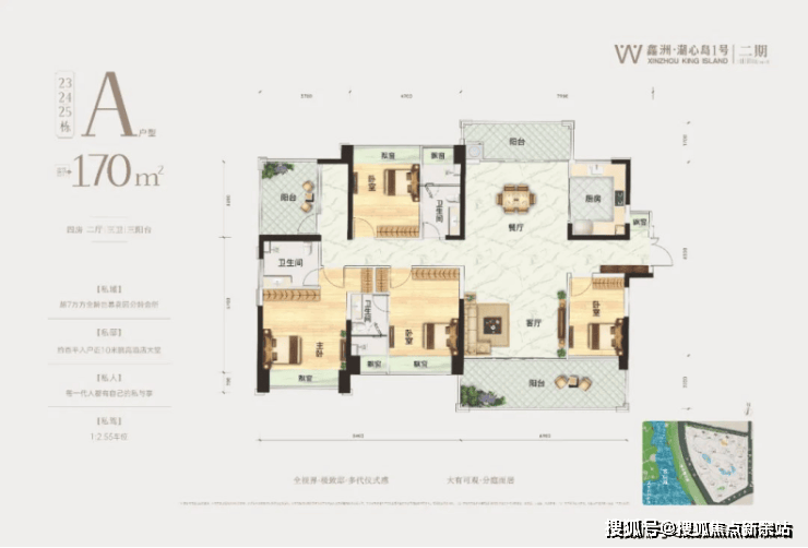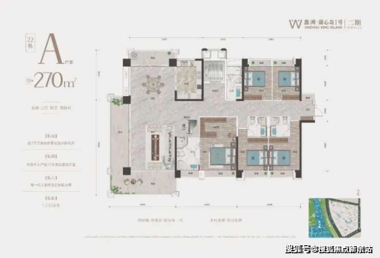 这种大户型做5房在空间上自然很宽裕,2卧室为套间设计,其中主卧带生活阳台、衣帽间,兼顾主人私密性和舒适度。 🦙鑫洲湖心岛1号售楼处电话为:400-858-9905☎开发商已认证🦙🦙