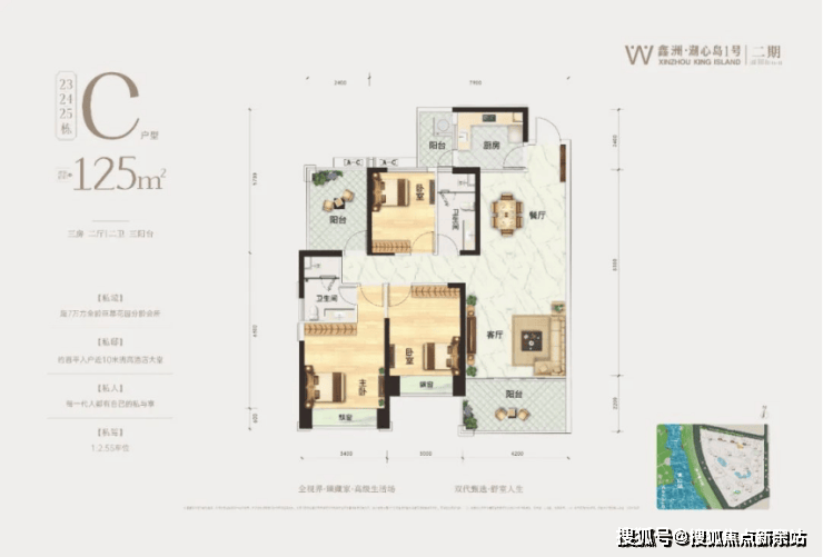 23栋C户型:建面约125㎡,3房2厅2卫