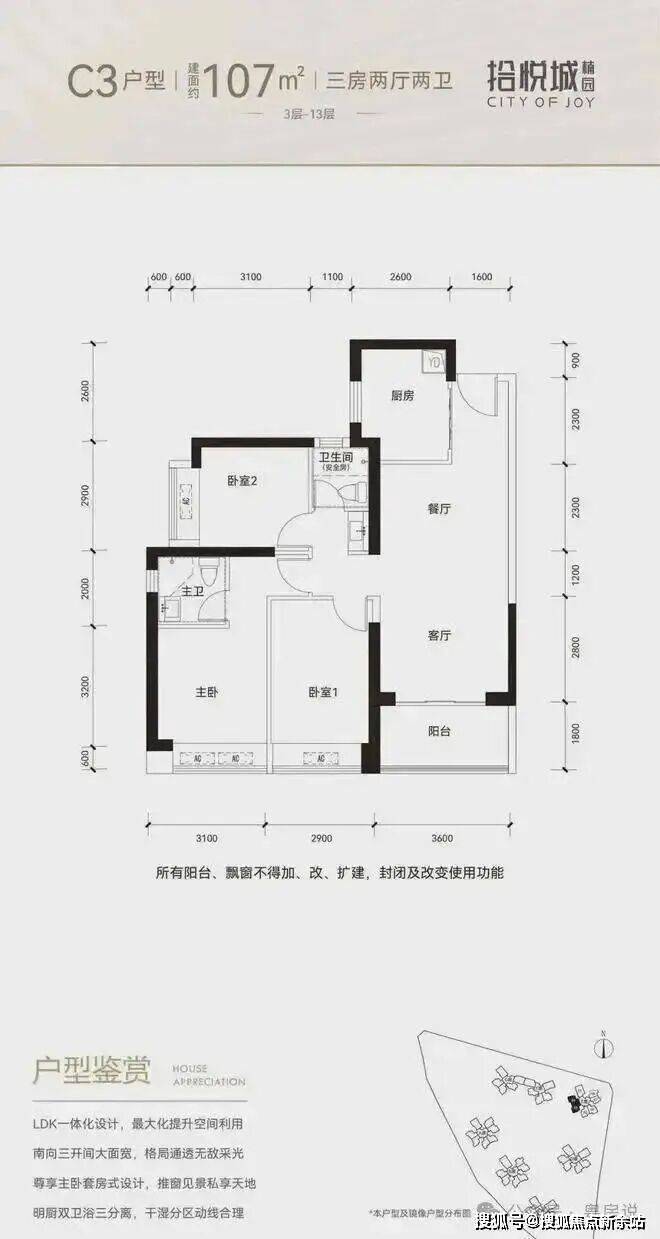 100平三房:设计的是竖厅格局,进门入户玄关,客厅3.4米开间,LDKB一体化设计,3个卧室分别做到了3米/2.9米/2.5米的宽度,U型厨房,公卫三段式分离,得房率:77.14%(不含赠送),阳台1.8米宽度,西南或东南朝向。