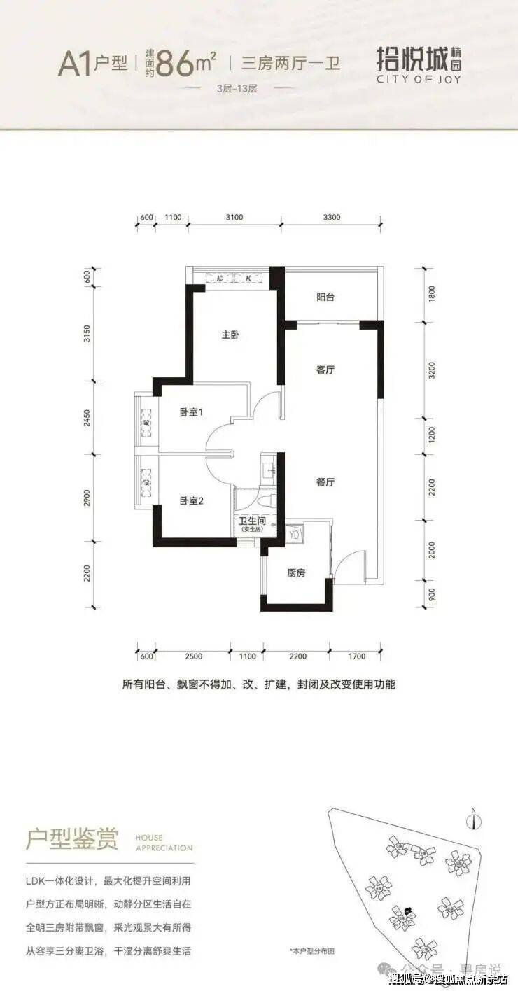 86平三房:设计的是竖厅格局,进门入户玄关,客厅3.3米开间,LDKB一体化设计,3个卧室分别做到了3.1米/2.9米/2.45米的宽度,U型厨房,卫生间三段式分离,得房率:76.92%(不含赠送),阳台1.8米宽度,东北朝向。
