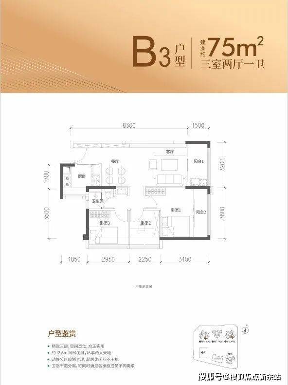 特点:LDKB一体化设计,主卧11.3㎡(含飘窗),次卧7.28㎡(含飘窗)x2。