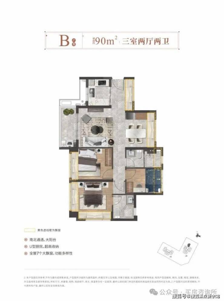 90㎡的3房2厅2卫,设计的是竖厅南北通透格局,全屋飘窗设计,客餐厅错开布局,主卧双飘窗,U型厨房。