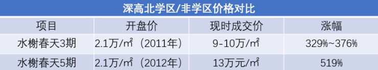 深高北附近的楼盘,像莱蒙水榭春天的5期,价格可以去到13万元/㎡,但是不在深高北学区范围内的1-3期,成交价才9-10万/㎡。