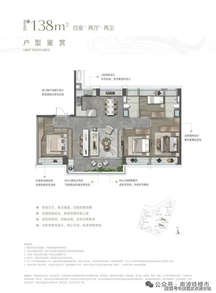 南北通透大采光:两栋板楼坐北朝南,坐拥一线大南山,一字型布局,大面宽,小进深,自然风全天循环、100%阳光健康舒居。