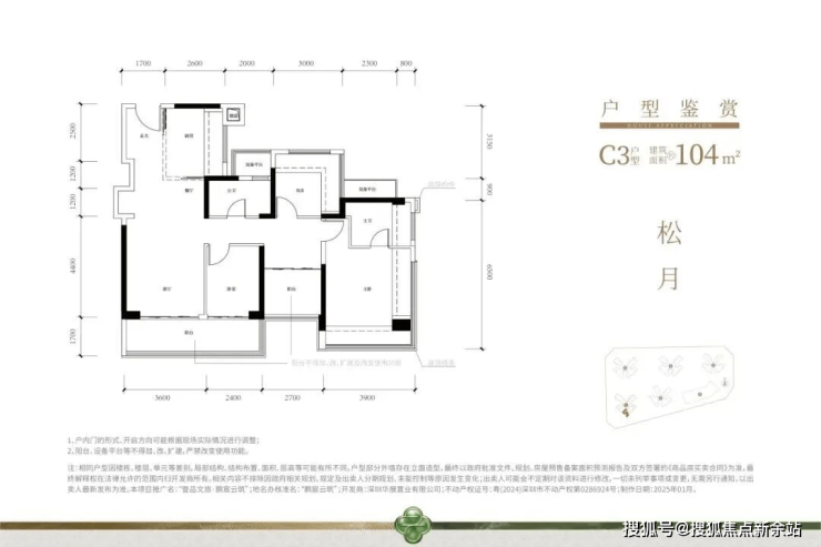 主力户型是104㎡的产品,带10.2㎡的阔景阳台,双阳台、双设备平台设计,加上主卧、书房L型阔景飘窗,户型使用率颇高。
