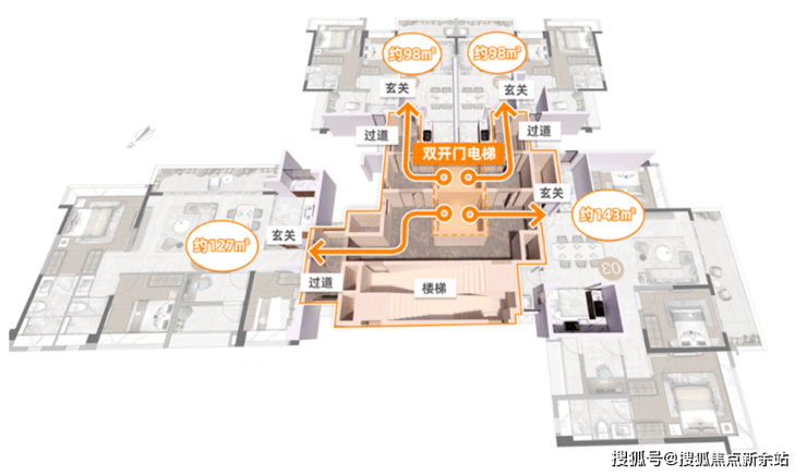 户型方面做到类专梯入户,两梯四户梯户比+双开门电梯,类专梯专户的豪宅高标。