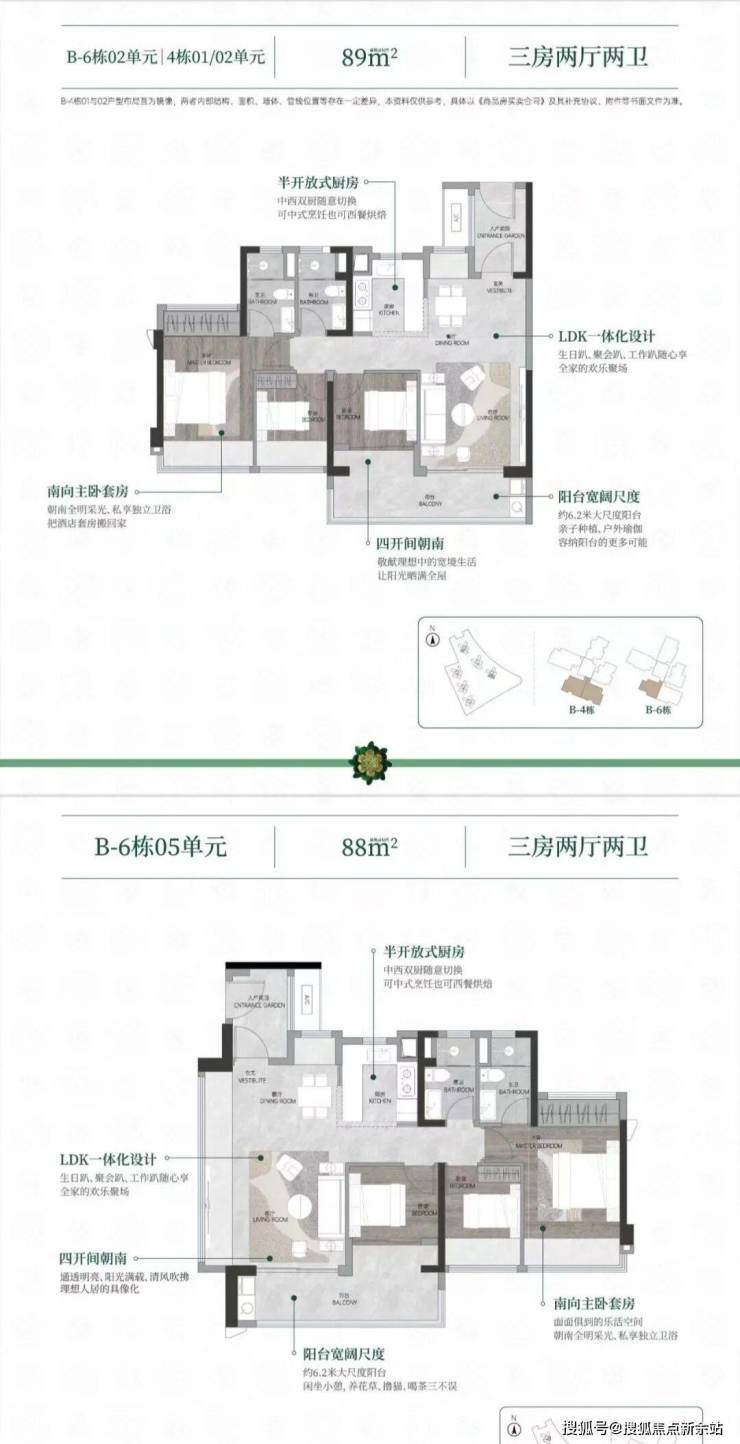 整个社区围合式布局,采用风车形楼型,取消北向户型,全南向排布,同等面积,朝向更佳;基本实现四开间以上,保证两个以上卧室南向,比同等南向产品品质感更强。