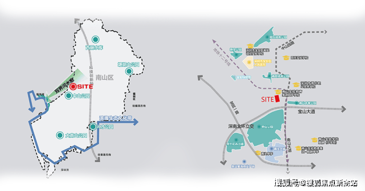 深圳南山区中部组团,属于粤港澳大湾区第一发展圈层,是高新技术、文化创意、文脉传承于一体的创新发展片区。场地区域位置优越,周边配套丰富,2KM 范围内有公园、学校、南头古城商圈、医院、地铁等;场地高层视线开阔,可远眺深圳湾。