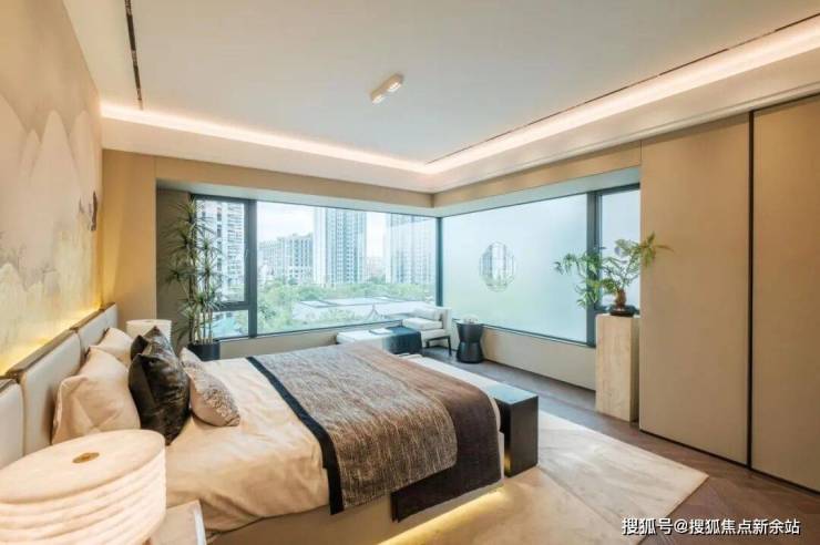 空间均衡分配下的生活满足。主卧整体面积升级到超32㎡,相当于一个星级行政套房的规模,还拥有三面飘窗PLUS设计和270°的景观享受。业主不仅能放下2米大床,还能同时加上2个床头柜,尽显大宅的尊贵感。L型落地飘窗的位置也能利用起来,可以是功能空间,也可以是精神港湾。设置迷你吧、阅读角、健身or育儿区......