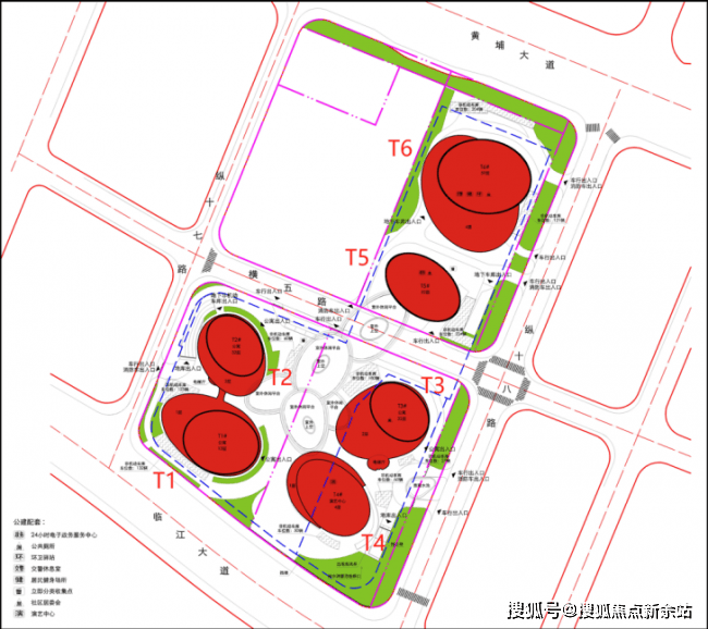 从规划图示可知,鹏瑞1号项目的总建筑面积高达27.09万平方米,由6栋圆柱形建筑共同构成。最为临近江边的T1栋是13层高的公寓,T4栋为4层高的演艺中心;位于中间位置的T2、T3栋是32层高的公寓;而T5栋和T6栋则分别为52层和59层的商业商务大楼。