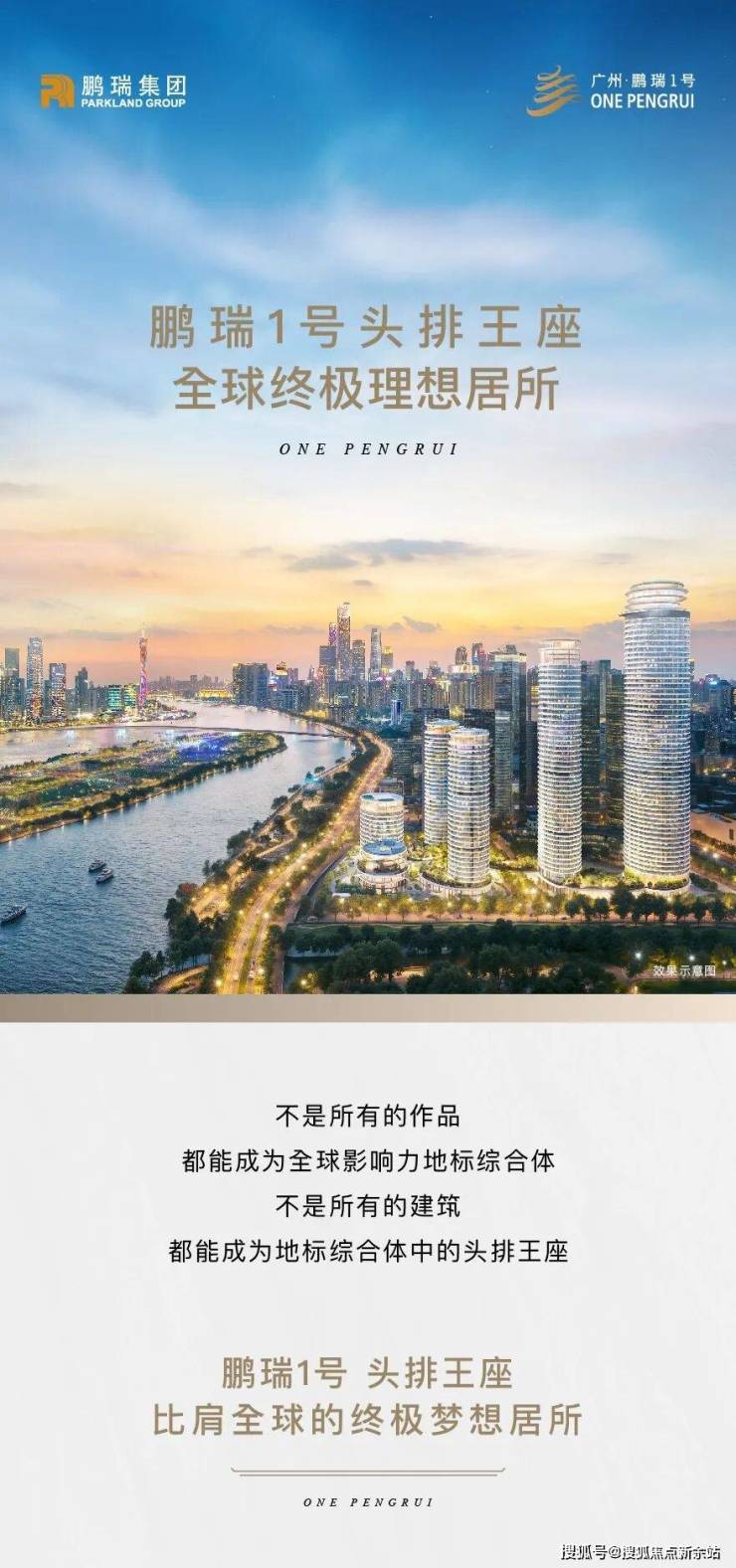 广州·鹏瑞1号项目,占地面积约5.42万平方米。整体规划布局中,共计规划建设6栋建筑。项目业态丰富多元,涵盖了顶级奢华公寓、极具传奇色彩的奢华酒店、湾颂·艺术中心、广州·深湾会以及湾汇高定商业中心等。