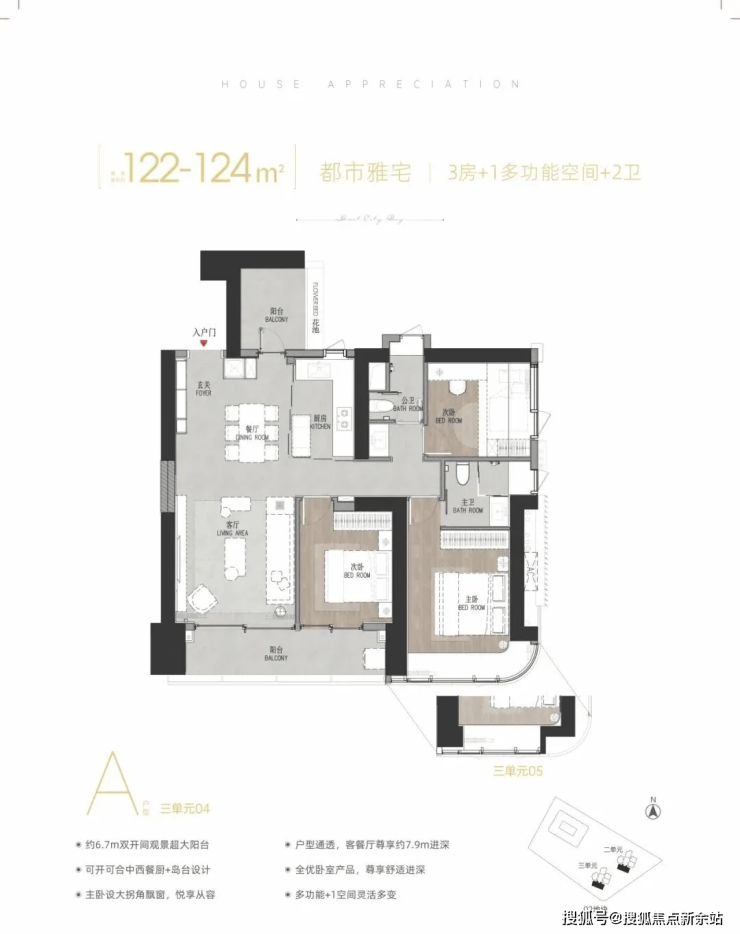 约6.7米双开间观景超大阳台,户型通透朗阔,客餐厅以约7.9米进深从容铺展,赋予居家生活不凡气度与仪式感,每一处细节皆彰显空间的尊贵与从容。