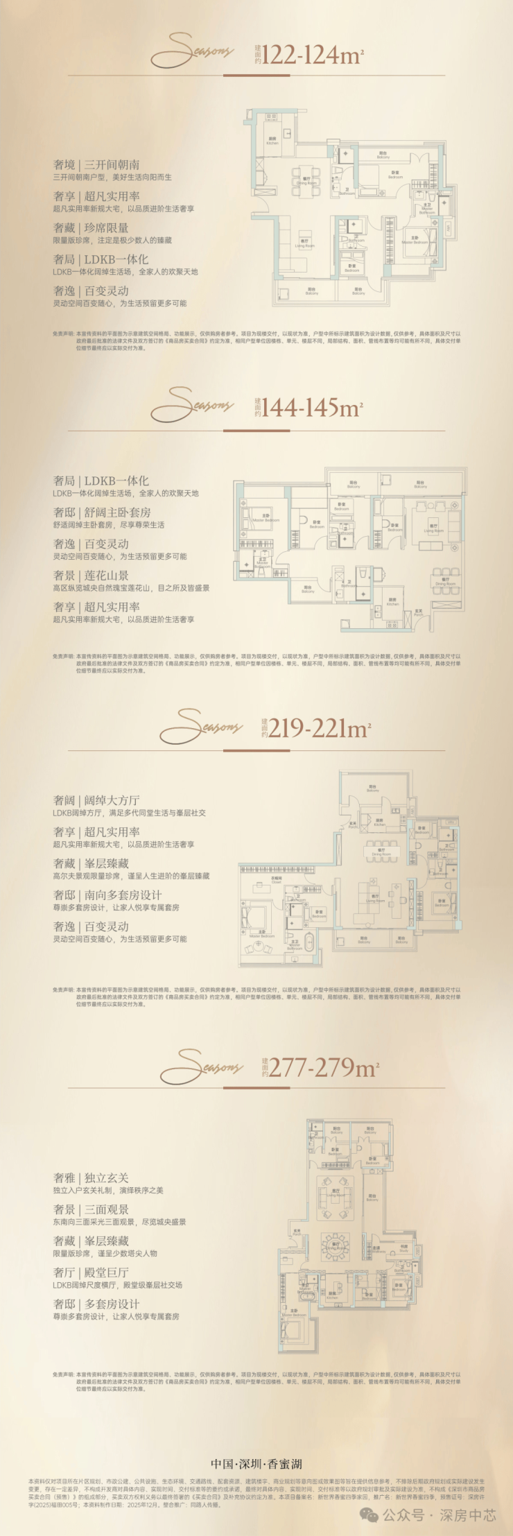 新世界香蜜四季总建面约46.7万㎡,占地约4.1万㎡,容积率7.62,绿化率30%,规划10栋建筑,其中商品住宅923户,车位比约1:2.9,停车无忧。主力户型涵盖105-280㎡,主打105-144㎡三房四房、190-280㎡高端改善大平层,低区3梯5户、高区3梯3户,得房率约81%,精装配大金、汉斯格雅等一线品牌,适配多元高净值改善需求。