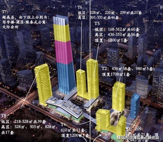 北区T1是写字楼,T2、T3、T4为公寓,南区T5、T6、T8为公寓,T7为环球商务中心;总建筑面积47.5万㎡。