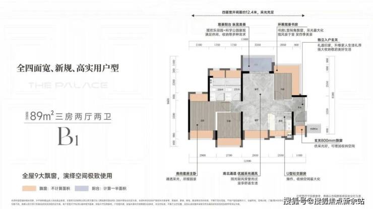 89m²的3房2厅2卫,B1户型,设计为南北通透竖厅,入户可设800库,客厅3.35米宽,客餐厅独立。总开间12.4米,主卧14.4m²,次卧10.83m²和8.37m²(含飘窗)。U型厨房,卫生间干湿分区。客厅阳台5.7m²朝西北,可观科学公园。