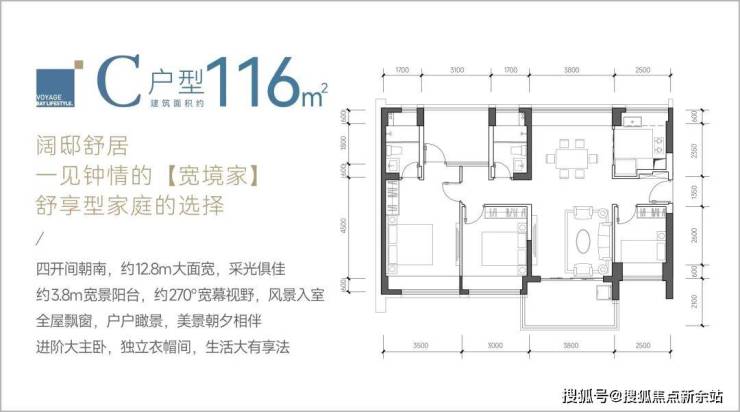 116㎡四房两卫:总价739-806万,南北通透格局。客厅开间3.8米,四开间朝南,主卧17.85-18.02㎡,得房率最高达93.13%