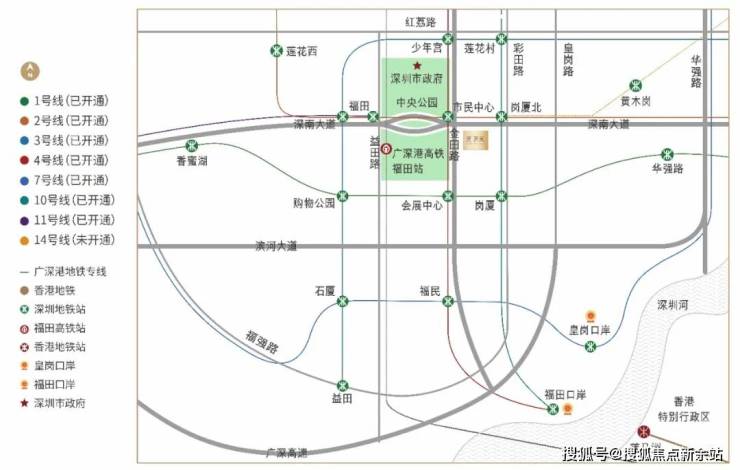 • 2大综合交通枢纽(福田高铁站、岗厦北交通枢纽)• 2大超级口岸(福田口岸、皇岗口岸)• 2条城市东西干道(深南大道和滨河大道)• 8条地铁线(1号线罗湖-机场、2号线莲塘-赤湾、3号线福保-双龙、4号线福田口岸-牛湖、7号线西丽湖-太安、10号线福田口岸-双拥街、11号线福田-碧头、14号线(施工中)岗厦北-沙田)