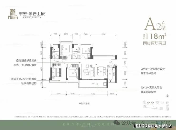 118㎡的4房2厅2卫,设计的是横厅南北通透格局,客餐厅6.2米开间,LDKB一体化,五开间朝南,西北面5.4米长的观景大飘窗,分别做到了主卧16.66㎡/次卧9.72㎡/次卧9.18㎡/次卧6.9㎡(包含墙体飘窗),L型厨房,卫生间干湿分离,得房率约76%(不含赠送),客厅连接餐厅位出6.2米长的大阳台约10.54平,东南朝向。