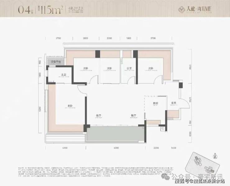 下面的04户型是常见的横厅户型,115平4房2卫,边户,很通透,朝南,特点是主卧和两个次卧都能实现双面飘窗采光,得房率高,且非常合理地设置了入户玄关,避免了多数横厅户型存在的大门正对主卧门的缺点。另外,客餐厅同时出大阳台,整个公区显得非常宽敞舒适。
