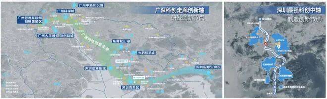 双轴:广深科创走廊创新轴-研发创新节点和深圳最强科创中轴-制造创新节点,东起深圳国际生物谷,西至广州琶洲互联网创新集聚区、南联深圳科技园和后海商务区,北接松山湖,肩负共筑“创新脊梁”的重要使命