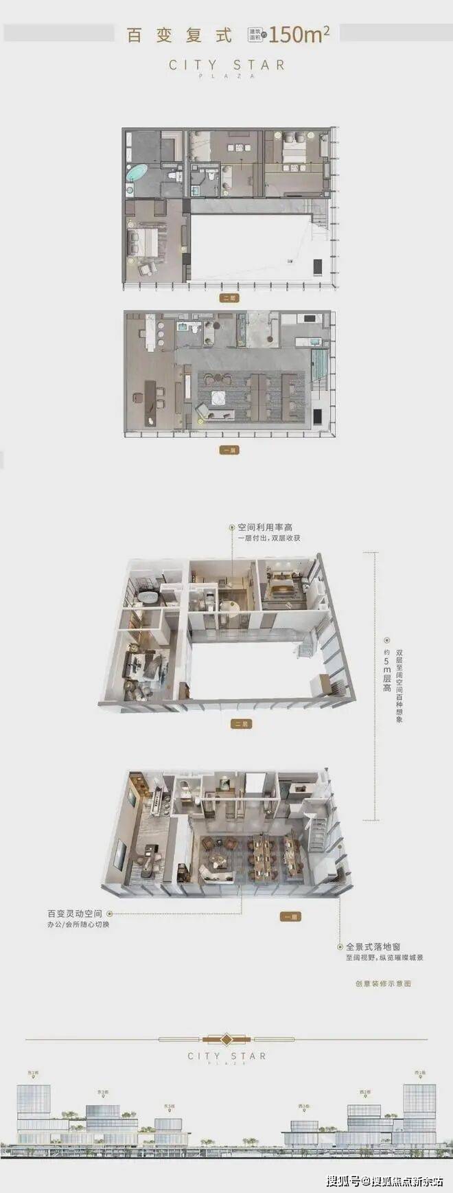 【约150㎡百变复式】:约5米挑高复式,灵动空间双倍实用率,办公、会所灵活转换,资产配置“投”号之选。