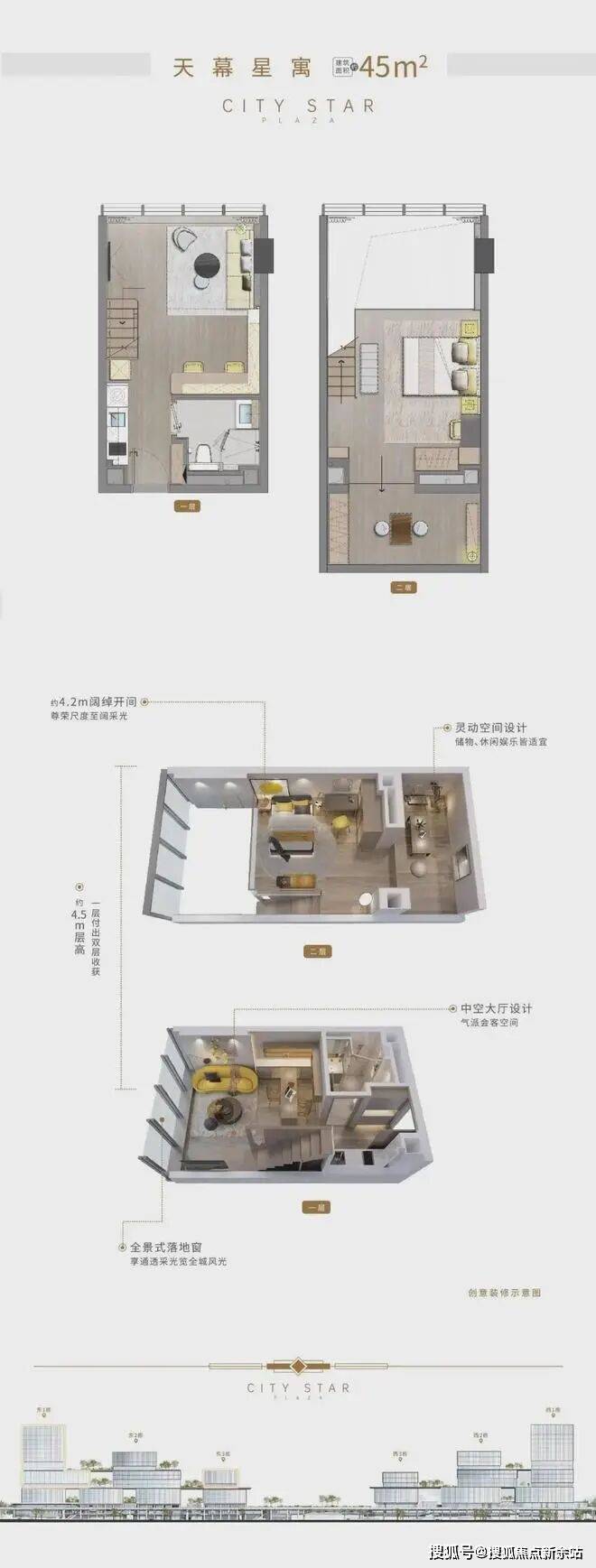 【约45㎡天幕星寓】:约4.2米阔尺开间金领小户型,低门槛轻松买入地铁上盖物业,约4.5米挑高双层享受,双层动静分区,宜商宜租。