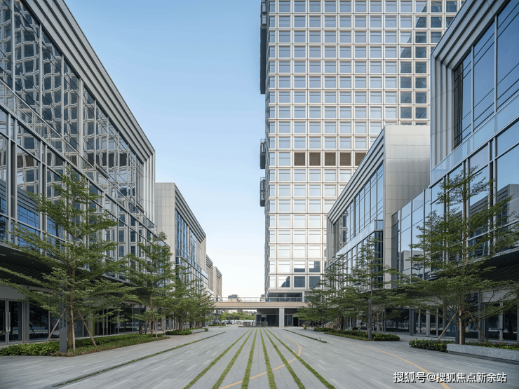 裙房立面的叙事则更贴近人文温度。冰裂纹釉面陶板釉面下冰晶般交织的肌理,在不同光线与视角中呈现细微变幻,既与塔楼的科技感呼应,又为建筑基座注入一抹温润底蕴。米黄色铝格栅以柔和的线性肌理与之搭配,进一步柔化体量、营造更具亲和力的近人尺度环境。陶板的实与格栅的虚形成二次对话,进一步丰富了立面层次。
