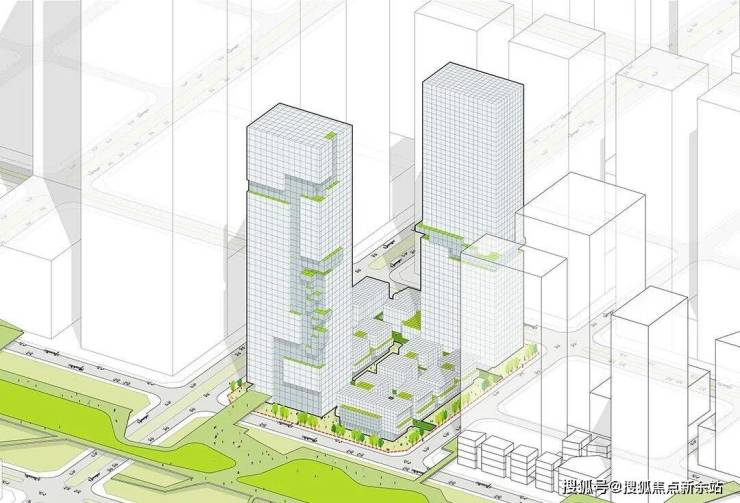 设计将深超总的绿色廊道视为城市生命的自然延伸,以建筑为媒介,实现人与自然的深层对话。通过建筑与生态系统的深度融合实现与城市脉搏的同频共振。双塔以错动布局主动迎上中央绿轴,层叠的空中露台与退台形成向上延展的绿色界面,犹如绿脉自然攀升,将城市级生态序列引入建筑垂直维度。