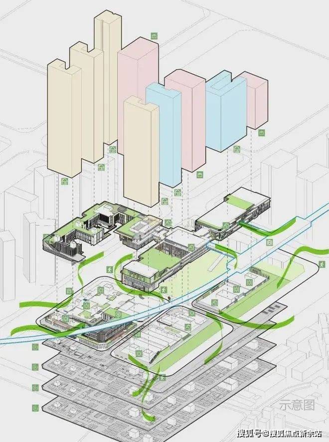 垂直交通场景:多首层设计,空中连板、无风雨连廊等,形成住宅、商业、办公与地面公交、空中地铁的接驳体系。