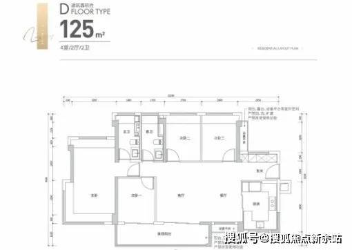 125㎡的4房2厅2卫,设计的是横厅南北通透格局,进门入户玄关,客餐厅6.3米开间,客厅连接次卧出6.8米长的大阳台,主卧南北通透设计,4个卧室分别做到了3.2米/2.8米/2.7米/2.6米的宽度,U型厨房,卫生间干湿分离,得房率:80.85%(不含赠送),阳台主朝西南向。