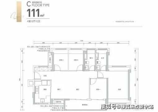 111㎡的4房2厅2卫,设计的是横厅南北通透格局,进门入户玄关,客餐厅5.8米开间,客厅连接次卧出6.4米长的大阳台,主卧南北通透设计,4个卧室分别做到了3.2米/2.6米/2.35米/2.25米的宽度,U型厨房,卫生间干湿分离,得房率:80.86%(不含赠送),阳台主朝西南或东南向。