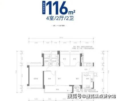 116㎡的4房2厅2卫,设计的是横厅南北通透格局,进门入户玄关,客餐厅5.7米开间,客厅连接次卧出6.45米长的大阳台,主卧南北通透设计,4个卧室分别做到了3.15米/2.75米/2.35米/2.25米的宽度,U型厨房,卫生间干湿分离,得房率:77.44%(不含赠送),阳台主朝西南或东南向。