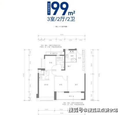 99㎡的3房2厅2卫,设计的是竖厅格局,进门入户玄关,LDKB一体化设计,客厅3.5米开间,三开间朝南,客厅连接次卧出6米长的大阳台,3个卧室分别做到了3.2米/2.5米/2.3米的宽度,U型厨房,公卫三段式分离,得房率:77.43%(不含赠送),阳台朝西南或东南向。