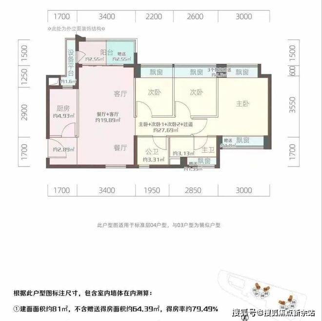81㎡的3房2厅2卫,设计的是竖厅南北通透格局,客厅3.4米开间,3个卧室分别是3米/2.6米/2.2米的宽度,L型厨房,得房率:94.35%(包含赠送),阳台西北或东北朝向。