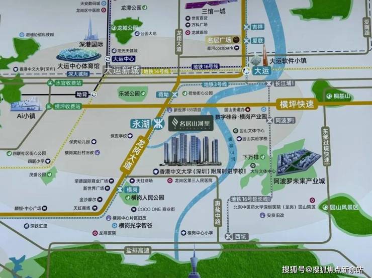 名居山河里雄踞龙岗园山街道核心,坐拥大运新城+阿波罗未来产业城+横岗中心三极交汇红利,距地铁3号线永湖站仅150米,以约48万㎡恢弘体量,打造集住宅、商业、教育于一体的都会综合体。