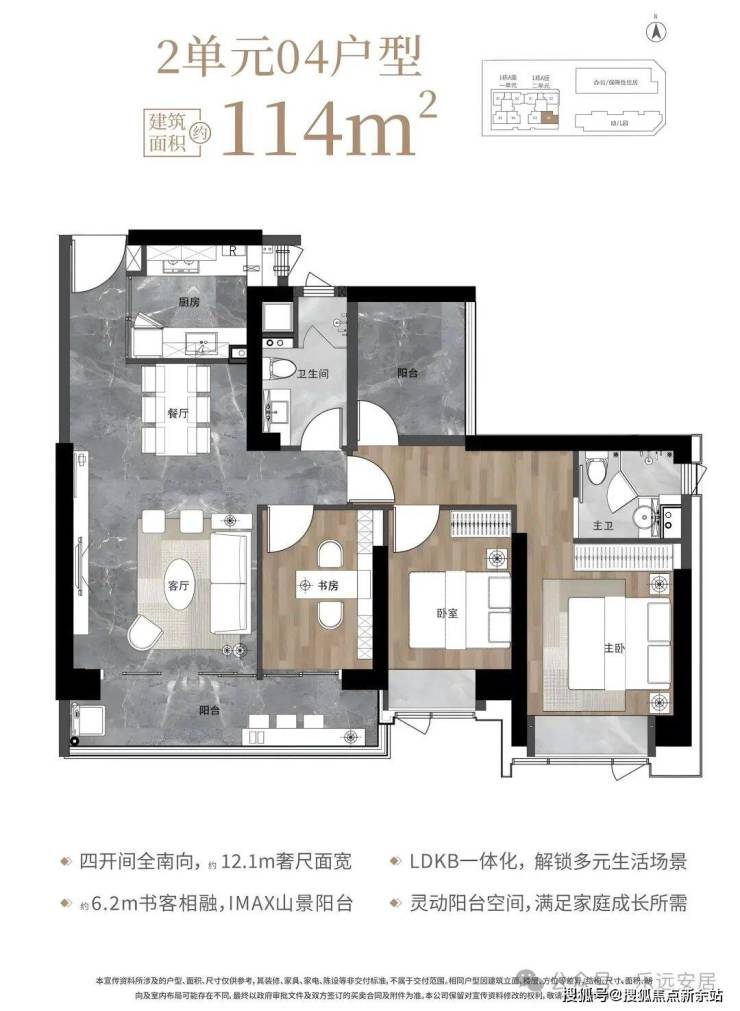 114㎡的4房2厅2卫,1栋2单元04户型,设计的是经典竖厅格局,客厅3.85米开间,LDKB一体化设计,动静分区,四开间朝南,12.1米面宽,二字型厨房,卫生间干湿分离,客厅连接次卧出6.2米长大观景大阳台,正南朝向。