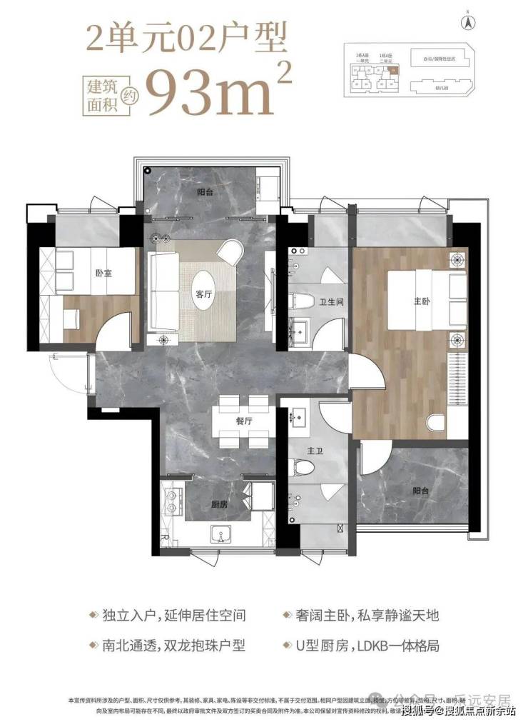 93㎡的3房2厅2卫,1栋2单元02户型,设计的是竖厅南北通透格局,独立入户,客厅3.6米开间,客餐厅分离设计,U型厨房,卫生间干湿分离,阳台正北朝向。