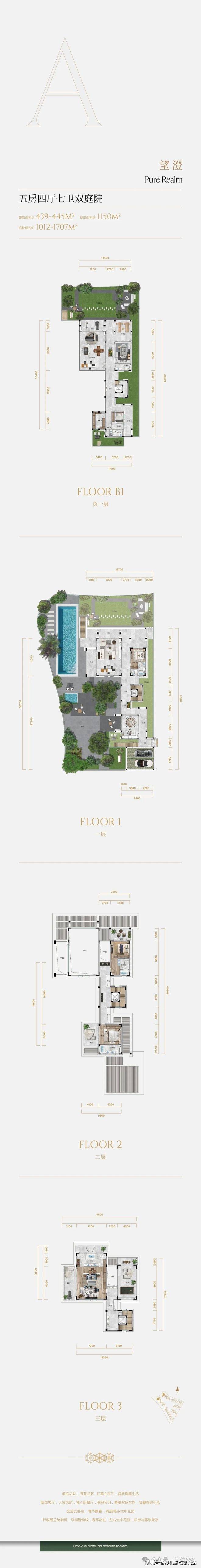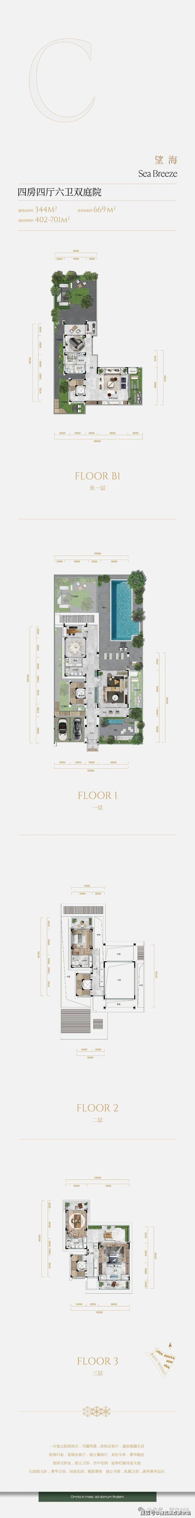 「山海之间 千平大院 独栋别墅」建面约344-445㎡独栋,千平大院的传世藏品①超低密规制,约0.3容积率②层层阔绰花园,无界度假风情③行政级主卧,奢华规制私密静逸