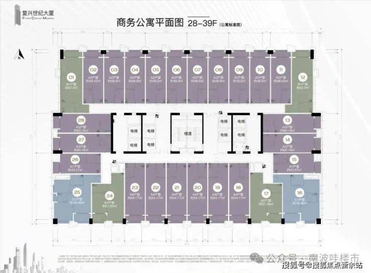 公寓8梯28户,办公6梯15户,商业4梯34户